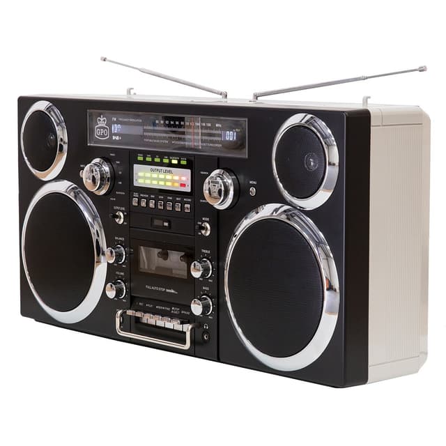 Denne GPO Brooklyn ghettoblaster er et fullt transportabelt musikkanlegg, som tar 80-tallets Boom Box og sender den inn i det 21. århundre. To 40-watt høyttalere gir din musikk volum, den fortjener, og hvis du ønsker å få mer kan du tilføye eksterne høyttalere . Mulighet for å styre lydstyrken, balanse, bass og diskant.