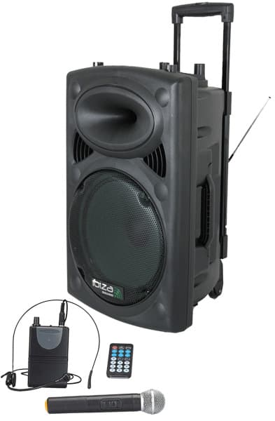 Transportabel høyttaler med 12"" bassenhetMed innebyggd ladbart batteri Enkel transport på trolley-hjul.Fjernkontroll medfølger2 trådløse UHF mikrofoner medfølger.Kan avspille mange formater - bl.a BluetoothLes mer om produktet