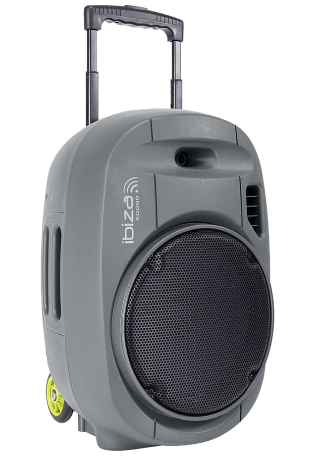 Ibiza transportabelt ladbart lydsystem. 12"" høyttaler, maks 700W. 2 trådløse mikrofoner og innebyggd ekko. Rekkevidde opp til 30 meter utendørs. Trolley, håndtak, hjul for enkel transport. Les mer om produktet