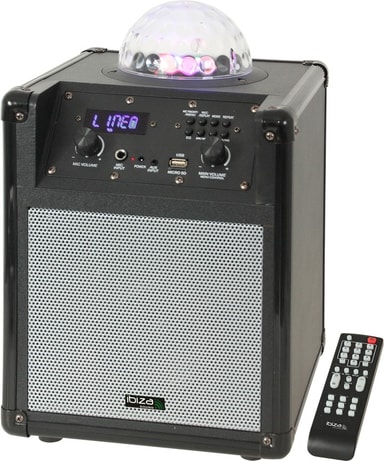 Ibiza sound portable stand-alone speaker with rgb astro light effect portable, battery - or mains powered speaker box with built-in amplifier combined to an rgb light effect for mobile and karaoke use. usb, micro sd & bluetooth inputs. 1x mic input with priority function. 1x aux input. fm tuner with pre-set stations. lcd display. rec function. recessed handle on the rear panel & shoulder strap. remote control & leads included.