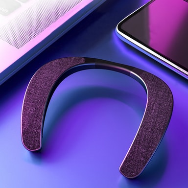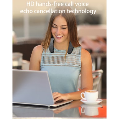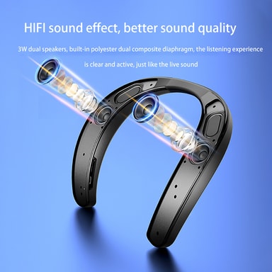 Unik Neckband Wearable Design: Denne elegante svarte, stoffdekkede neckband-høyttaleren tilbyr håndfri bekvemmelighet. Den ergonomiske designen gir komfortabel bruk hele dagen, noe som gjør den perfekt for treningsøkter, utendørsaktiviteter og lytting på farten.