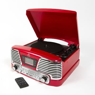 GPO Memphis - Rød Smart system i stilrent retrodesign med innebygde høyttalere, platespiller, CD, USB, SD-kort og FM-radio, så du kan avspille din musikksamling Èn plass. Kan avspille plater med 33, 45 og 78 rpm (omdreininger i minuttet). Ta opp alle dine vinyl- eller cd'er på en USB-nøkkel eller et SD-kort. Innebygd cd-avspiller. Innebygd dobbelt stereohøyttaler med 2 x 1,5 watt output (3 watt i alt). Innebygd forsterker. Auto stop-funksjon. Leveres med ekstra pickup-nål. FM-radio med digital LCD-skjerm. Bass Boost-funksjon. Fjernkontroll inkludert. 3,5 mm jakkstikk til tilslutning av MP3-avspillere og smartphones (tilslutningskabel inkludert). Kompatibel med eksterne høyttalere, herunder GPO Westwood og GPO Westwood Mini. Vekt: 3,4 kg. Mål: B 38 x D 37 x H 17,5 cm. Fås i svart og rød.