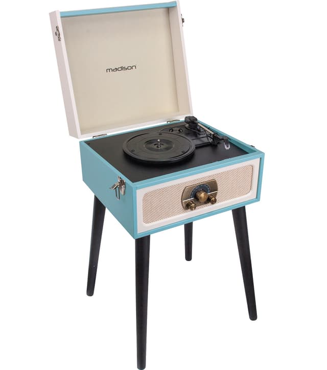 Madison Retro PlatespillerLytt til dine gamle vinylplater og gjem dem på et USB / SD-drev på denne smarte retro platespiller med innebyggd forsterker og høyttalere. State-of-the-art teknologi i et vintage kabinett med ben.Platespilleren har Bluetooth. USB og SD-inngang samt FM tuner.