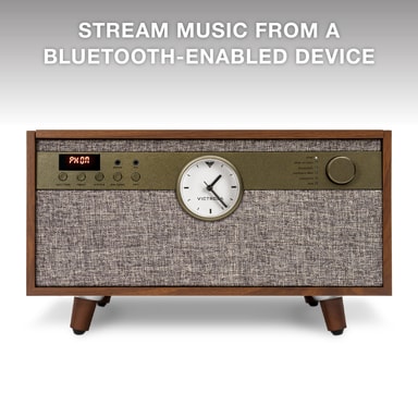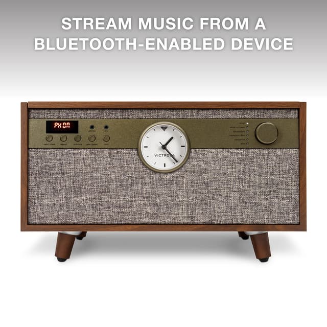 Victrola Century Signature er et allsidig musikksenter med platespiller, CD, kassett og trådløs tilkobling. Den har et analogt ur og forbedrede stereohøyttalere, samt Vinyl Stream for trådløs avspilling av plater. Elegant retrodesign med RCA, AUX og hodetelefonutgang. Spesifikasjoner: • Hastigheter: 33 1/3, 45, 78 RPM • Medier: Vinyl, CD, kassett • Pickup: ITNP-LC1 • Utganger: Bluetooth, RCA, hodetelefon • Mål: 41,1 x 37,9 x 19,8 cm • Vekt: 7,14 kg