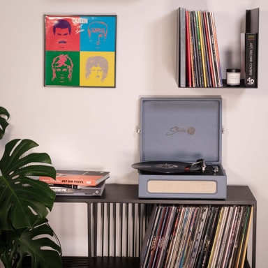 Dette bundle består av 1 Studio 57 Groovy Platespiller (Blå), Studio 57 Vinylholder for 12"" Plater & 1 Rensesett for Vinylplater med børste i asketre.