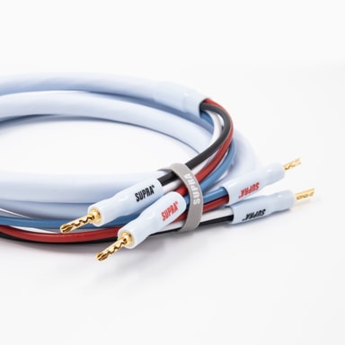 Supra Quadrax leveres med CombiCon-kontakter som kan byttes mellom spader og bananplugger. M6-gjengede adaptere gir maksimal fleksibilitet og pålitelig kontakt for både nåværende og fremtidige oppsett.