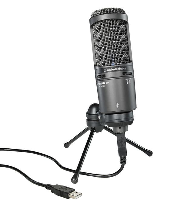 Audio-Technica AT2020USB+ er en USB kondensatormikrofon med nyrekarakteristikk (cardioid) og A/D converter med 16 bit, 44.1/48 kHz sampling rate. Med på kjøpet fås en tripod-holder til mikrofonen, som kan settes på alle vannrette overflater.
