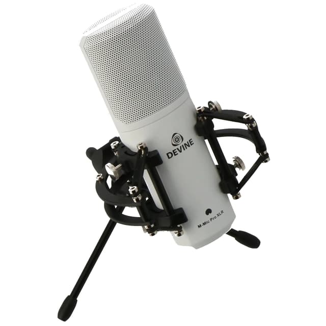 Devine M-Mic PRO XLR kondensatormikrofon (hvit) Allsidig kondensatormikrofon. Stort mikrofonhode. XLR-tilkobling. Klart og bredt frekvensområde. Komplett pakke med mikrofonholder, sjokkfeste og kabel. Kardioid lydopptak.