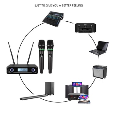 Trådløs bekvemmelighet med batteristrøm: Systemet opererer på standard batterier, og gir en trådløs opplevelse for ekstra bekvemmelighet. Du trenger ikke å bekymre deg for tungvinte kabler – bare slå på og nyt det enkle å flytte rundt under presentasjonene eller forestillingene dine.