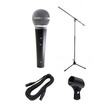 Grooveland Komplett mikrofonsett som inneholder: dynamisk mikrofon med bryter, 5 meter XLR mikrofonkabel, mikrofonstativ og mikrofonholder