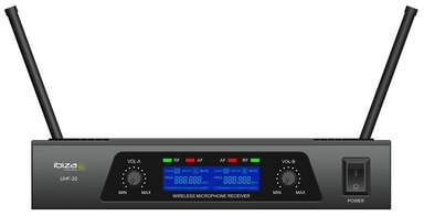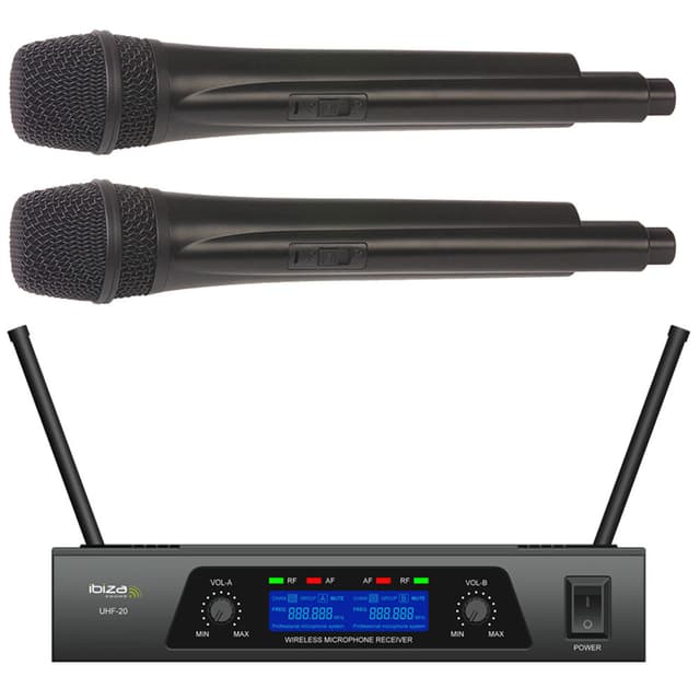 Ibiza 2 kanals trådløst mikrofonsystem Trådløst UHF mikrofonsystem.Består av 2x håndholdte mikrofoner, sender og en 2-kanals mottaker utstyrt med en LCD-skjerm.Ideell til karaoke, sangere, entertainere mv.Fast frekvens.2x frekvenser: 863.90Mhz & 864.90Mhz.LCD display.God immunitet mot interferens.Overholder R & TTE-standarden.Output volumen kontroll på mottaker.
