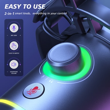 Mikrofonen gir umiddelbar kontroll med en dedikert 2-i-1 smart knott for volum- eller forsterkning-kontroller for å justere mikrofonfølsomheten direkte. Den inkluderer en øyeblikkelig Tap-to-Mute-sensor med LED-indikator for rask demping og kontroller for å veksle mellom eller tilpasse RGB-belysningsmodusene.