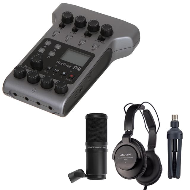 Zoom ZDM-1 Podcast Mic Pack er en perfekt følgesvenn for PodTrak P4 podcast-opptakeren, og inneholder alt du trenger for å fullføre podcastingstudioet ditt hjemme - en mikrofon, hodetelefoner, et bordstativ-mikrofonstativ, en mikrofonkabel med mere.