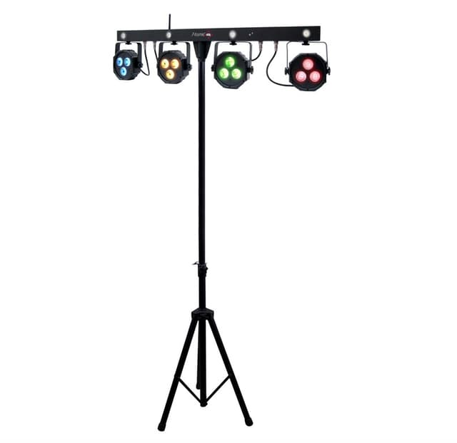 4 x LED par lamper. 108 W TCL RGB-lys. 4 x Led Strobe White 1W. 1 x stativ ( kan heves opp til 250 cm.) 1 x trådløs pedalboard. 1 x transportveske. LED-lys med redusert varmeavgivelse. Les mer om produktet