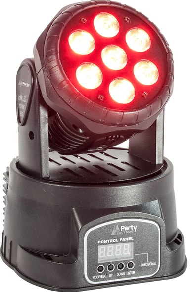 Party Light & Sound Moving Head Wash LED 7x8W RGBW Liten men kraftig moving head forsynt med 7x 8W flerfargede RGBW LED'er. Enheten er DMX-styrt og har en intelligent temperaturstyring og driftstidsvisning for å forlenge levetiden. 8 eller 13 DMX kanaler7 x 8W RGBW 4-in-1 LEDsRGBW fargemiksDimmer (0-100%)Musikkmode, Auto-run, Master and Slave & DMX 512Pan 540°, Tilt 180° LED displayBlåserkjølt.Beam angle: 25-30°