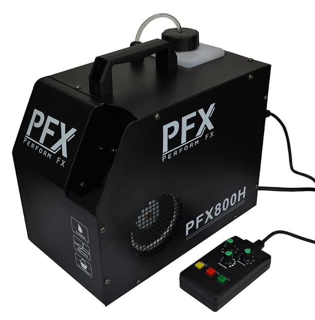 PFX800H DMX hazer tågemaskine En kraftig Hazer der udsender en tåge af røg i luften. Den leverer den perfekte mængde tåge til at fremhæve lasere og effektlys.PFX 800H er beregnet til anvendelse sammen med vandbaseret hazer væske (aldrig oliebaseret).800 watt varmelegeme, 1,2 liter tank og pålidelig pumpe gør denne hazer til det oplagte valg for den professionelle bruger.PFX 800H kan DMX styres men leveres også med en kablet fjernbetjening med timer funktion, blæser og output kontrol.Denne hazer har en særlig indbygget rengørings funktion, som automatisk renser varmelegeme efter brug for at forlænge hazerens levetid.