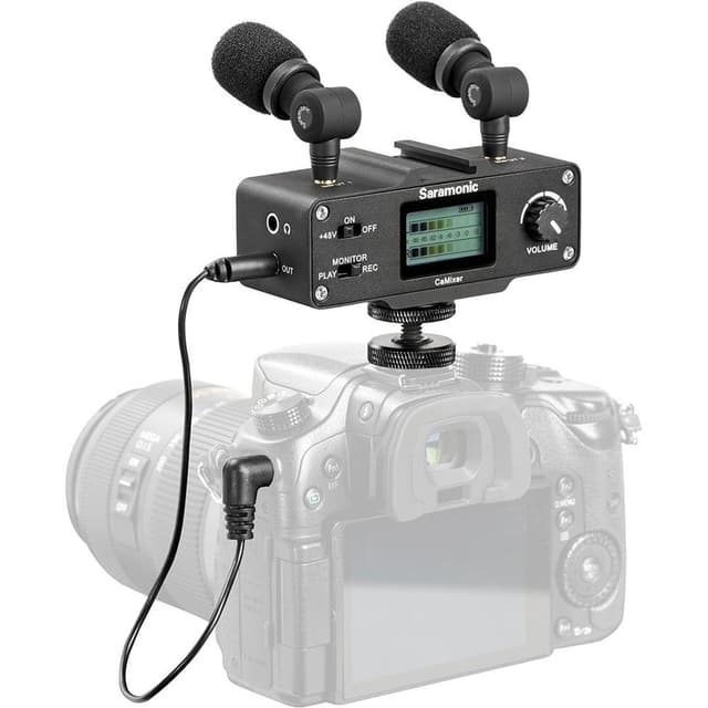 CaMixer Stereo kondensatormikrofonsett fra Saramonic er en tokanal, profesjonell lydmikser designet for bruk med DSLR og videokameraer. CaMixer leverer lydopptak av profesjonell kvalitet og har en mini-XLR-inngang og to 3,5 mm stereo mikrofoninnganger.