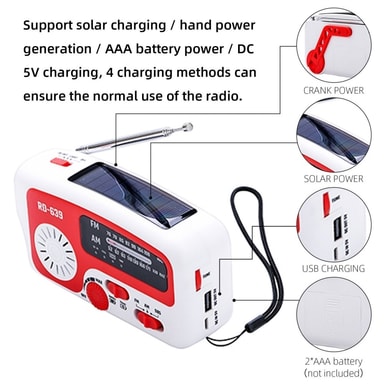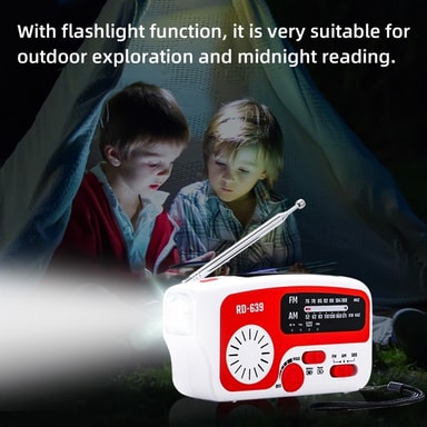 Støtter sollading/håndkraftgenerering/AAA-batteristrøm (ikke inkludert) /DC 5V lading, 4 lademetoder kan sikre normal bruk av radiostøtten for AM/FM-radio (AM520-1710KHZ-FM 87.5-108MHZ) Med lommelyktfunksjon, er det veldig egnet for utendørs utforskning og midnattlesing med ett klikk SOS-alarmfunksjon, som raskt kan