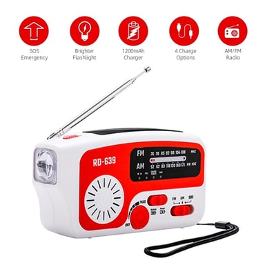 ode: sollading/håndkraftgenerering/AAA-batteri (ikke inkludert) /DC 5V lading Innebygd batteri: 3.V 1200mAh USB ladetid: 2.5-3h Håndsveiv Ladetid: 2-2.5h Solar ladetid: 35-40h fulladet radiotid: 5-7h fulladet belysning Tid: 9-10h SOS Alarm: Ja Lommelykt: JA Produktstørrelse: 14 x 7,5 x