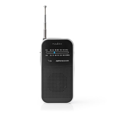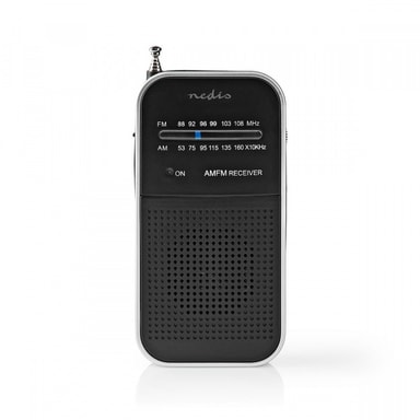 Nedis FM-radio | Bærbar design | AM / FM | Batteri drevet | Analog | 1.5 W | Svart hvit skerm | Hodetelefonutgang | IP20 | Aluminium / Sort