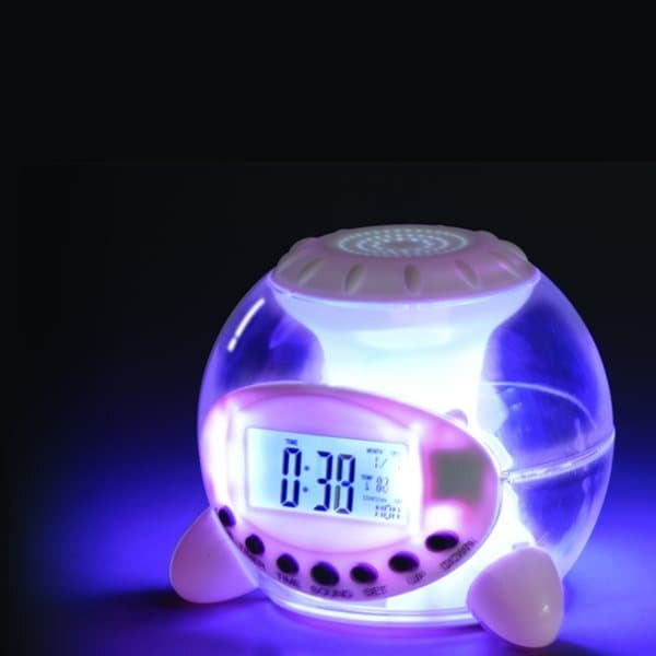 Fullastet digital klokke med harmonisk rolige ringetoner. Klokken skifter i seks forskjellige farger og har seks forskjellige ringetoner - jungel, skog, gård, havstrand, rislende vann og en blanding av alt.