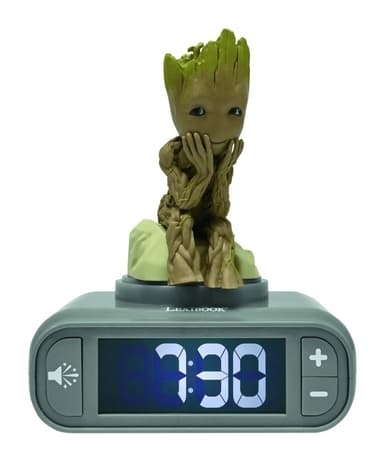 - Trykk på toppen av klokken/Groot for å stoppe alarmen eller lyse opp skjermen og basen til figuren.