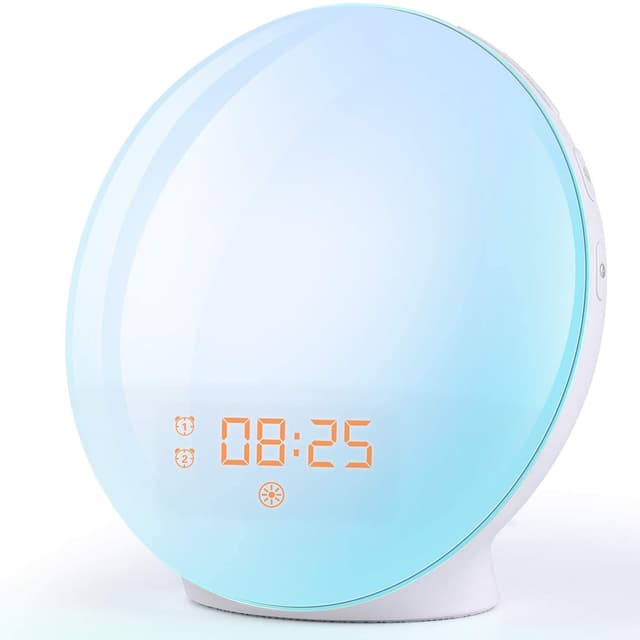 Våkn opp lettere, sovner bedre med denne klokken på nattbordet: Det kan være vanskelig å våkne og stå opp om morgenen, men med denne soloppgangsvekkerklokken blir det morsommere og lettere å våkne. Still inn alarmtiden og om morgenen når du våkner fra klokken, vil vekklampen gradvis øke fra 10% til 100%. Fargen på våkelyset kan sammenlignes med en soloppgang. Lyset skifter fra mykt rødt til sterkt sollys. Før du legger deg, senkes lyset gradvis ned til tonene av musikk, som en solnedgang. Lyset senkes fra 100% til 0%.