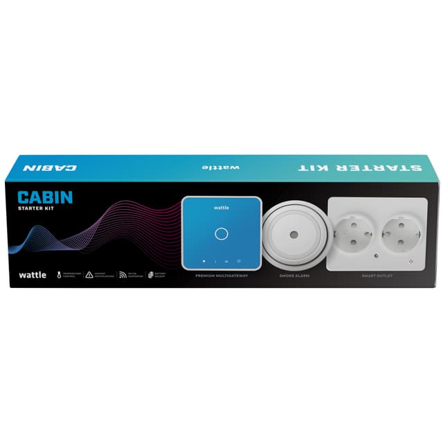 Med Wattle Connected Home hyttesett får du hjelp til å installere smartenheter som forvandler hytten din til et automatisert og koordinert smarthus. I settet finner du Wattle Connected Home Premium Multi gateway, et HCO (Home Control Outlet) og Wattle Home mini røykvarsler.