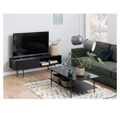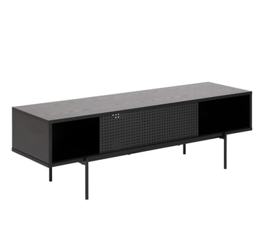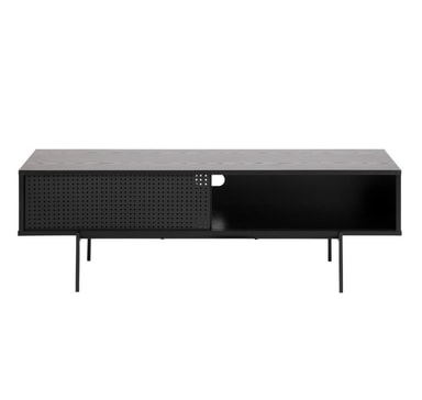 Angus TV-bord, melamin ask sort, 1 skyvedør: netting, pulverlakkert grovt metall, matt sort. L:140 B:40 H:44,5 cm