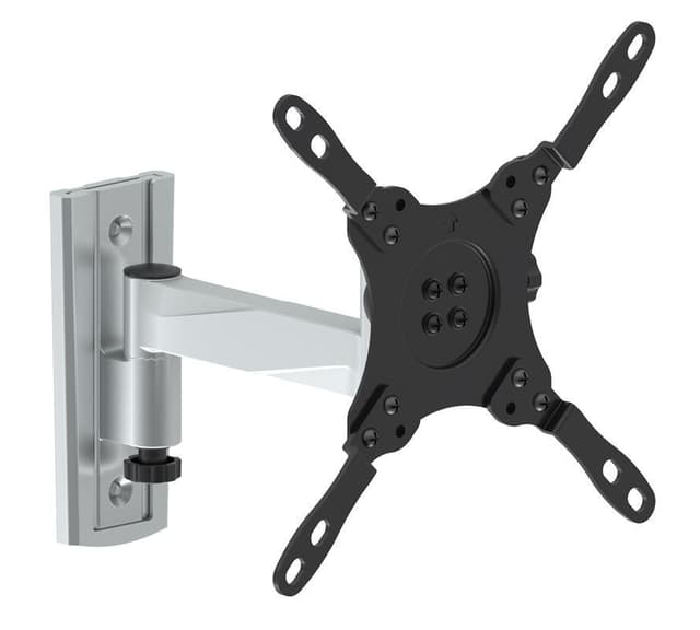 Wall mount with two-part arm which allows it to move in the depth direction. On the wall plate is a spirit preassembled to facilitate mounting and the arm are hooks to keep track of cables. The wall bracket is made of aluminum and steel.