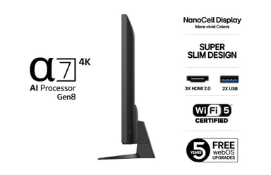 Opplev realistisk bildekvalitet med NanoCell-presisjon. NANO82 er utstyrt med NanoCell-teknologi og α7 AI Processor 4K Gen8, og byr på levende farger, skarpe 4K HDR10-bilder og smidig oppskalering. Med webOS, smarte funksjoner og et elegant stativ er dette en flott TV til hverdagens underholdning.