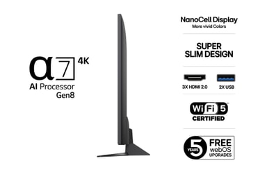 Tidligere kun i toppmodeller – den oppdaterte og forbedrede α7 AI-prosessoren er tilbake for å drive LG NanoCell TV. Den AI-drevne chipen forbedrer hvert bilde med skarpere detaljer, rikere farger og klarere lyd. Den analyserer innholdet ditt i sanntid og optimaliserer opplevelsen for strømming, gaming og direktesendt TV. Smart ytelse – alltid på topp.
