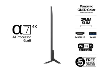 Drevet av α7 AI-prosessoren forbedrer LG QNED hver bilde med skarpere detaljer, rikere farger og klarere lyd. Den analyserer innholdet ditt i sanntid og optimaliserer opplevelsen for strømming, gaming og direktesendt TV. Smart ytelse – alltid på topp.